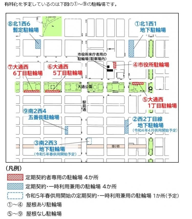 いままで大通公園にあった駐輪場も2022年4月から有料になりますのでご注意ください。